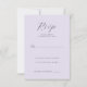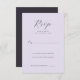 This elegant wedding RSVP card features a soft lavender background with sophisticated black script typography, creating an air of timeless elegance. The minimalist design focuses on clean lines and ample space for personalization, making it perfect for couples aiming to convey a refined and classic aesthetic. With its simple yet graceful style, this card is ideal for those planning a romantic or traditional wedding celebration. Its understated charm ensures that the focus remains on your special day while providing all necessary details in a tasteful manner.