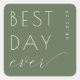 This elegant wedding sticker design features a minimalist and modern aesthetic with clean, white typography on a muted green background. The phrase "Best Day Ever" is prominently displayed in a mix of uppercase and cursive fonts, adding a touch of sophistication and joy. Perfect for celebrating special moments, this design exudes warmth and happiness, making it ideal for adorning invitations or keepsake boxes to commemorate your big day. Its simple yet stylish look ensures versatility for various personalized touches.