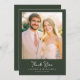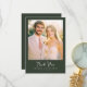 This elegant wedding thank you card features a warm, sunlit photo area that captures the essence of celebration and joy. The design is framed with a sophisticated dark green border, complementing the soft pastel tones within the image. The typography is stylish and modern, adding a touch of refinement to the overall look. Perfect for expressing gratitude after a special occasion, this card exudes a heartfelt and timeless charm, making it an ideal choice for newlyweds looking to thank their loved ones in style.