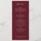 This elegant wedding menu design features a sophisticated maroon background with clean, classic typography that exudes timeless charm. The layout is simple yet refined, highlighting the text in an inviting and easy-to-read format. Perfect for a formal celebration, it conveys a sense of warmth and sophistication, making it ideal for couples who want to add a touch of class to their special day. With customizable elements, this design allows you to personalize your dining experience while maintaining its polished aesthetic.
