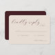 This elegant wedding RSVP card features a soft, blush pink background with sophisticated cursive typography that exudes timeless charm. The minimalist design focuses on clean lines and ample space for personalization, making it perfect for couples who prefer an understated yet refined aesthetic. With its simple color palette and graceful script, this card conveys a warm and inviting tone, ideal for setting the mood for your special day. It’s designed to seamlessly fit into any wedding theme while allowing you to add your unique details effortlessly.