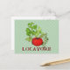 Stödja lokala jordbrukare och köpa färska frukter och grönsaker som inte behöver transporteras in och slösar värdefulla resurser. Färska örter och en mogen tomat med ord "Locavore" främjar denna förnuftiga syn på livsmedel.
