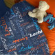 Typografisk text kort namn mitt i blått, grått, cyanblått, orange och vitt på en mörk blått anpassningsbar-filtdesign. Bakgrunden till färg kan ändras vid behov. Roligtens personlig personlig filt. Perfekt för bilen, camping för vinternätter eller resor ut. Personliggör med ditt eget kort namn, läser för närvarande Lochie för hjälp med personanpassning och andra namn-längder kontaktar mig. © Art och design av Sarah Trett för www.mylittleeden.com