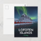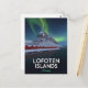Witness the stunning Arctic beauty of the Lofoten Islands, Norway, with this dramatic vintage-style postcard. The design features a row of iconic red fisherman's cabins (rorbuer) nestled beneath a snow-capped mountain, all illuminated by the spectacular Northern Lights (Aurora Borealis) across a dark, starry sky. This travel poster is perfect for lovers of Scandinavian travel, winter scenes, and celestial phenomena. Ideal for sending greetings, keeping as a keepsake, or framing as sophisticated wall art.