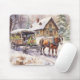 En vintage med ett logaritmhus och täckte vagn på vintern snögården med gamla byggnad och staket