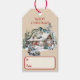 Logga in i Juletiketterna Bergsområden. Från vintern på kabinsamlingen. Logga in med Betlehem-stjärnan som lyser mycket. En vintage lastbil är lastad med gåvor och dekorationer för speciella dag. Kabinen är upplyst för gäster. Varm och mysigt. Perfekt för märkre av paket, presentsäckar, matgåvor. god jul!