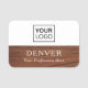 Modern namn bricka med ditt första namn och en brun träbakgrund med anpassningsbarnas logotyp ovan på vitt. Du kan byta typsnitt, flytta och ändra storlek på logotypen och andra inslag med verktyg som designläge.