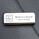 Vit namn bricka med svart och gyllene övertoning (tryckt färg-övertoning, inte riktig folie) gräns längs grund och ditt eget namn och titel. Ladda upp din egen logotyp och skapa namn bricka för ditt företag eller din händelse. Du kan byta typsnitt och färg med designen verktyg.