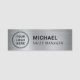 Modern arbetstid i namn bricka med ditt företags eller din organisations logotyp mot en silver-komplex metallisk bakgrund. Lägg till en namn och titel i enkel typografi.