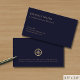 Gör ett bestående intryck med våra Professionell Blå Affärskort i marinen med Logotyp i Anpassningsbar Guld med klassisk typografi på en rik marin blå bakgrund. Baksidan har en slående guld-kompass-emblem som kan bytas ut mot din logotyp, tillsammans med utrymme för en ansvarsfriskrivning för branschen. Perfekt för professioneller inom näringslivet tittar att ge ett varaktigt intryck.