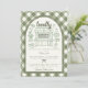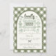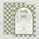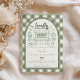 Djärv, charmig och full av karaktär, denna lokalt odlade baby shower-inbjudan har handritade illustrationer från bondens marknad med gröna ginghamkanter, fantasifulla detaljer om grönsaker och en rustik marknads skylt-känsla. Perfekt för en lokalt odlad, trädgård eller bondens marknad baby shower med en könsneutral grön palett som känns fräsch, rolig och helt aktuell.