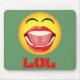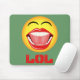 Sväng Ansikte © Sunny Mars Designs. Den här coolan, humoristisk, roligt, musknapp eller musmatta illustrerar en gult som skrattar ansikte-känslor med en öppen stormun, ljusvita pärltänder, tunga och stängt ögon, med akronymen "LOL" nedan som står för Laughing Out Loud under den. Koncept för humor.