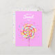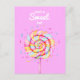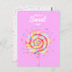 Vykort med multifärgad lollipop digital illustration på rosans bakgrund. Runt snurra rosa, gult och blått färg. Text "Ha en söt dag". Och karamellen faller mönster ram.