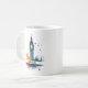 Un design abstrait, inspiré de l'art moderne, met en valeur la silhouette de Big Ben, soulignée de formes géométriques et de touches de couleurs vives parsemées sur la tour. Le ciel dégradé est remplacé par des aplats de couleurs dans un style pop art, conférant au design une allure dynamique. Des représentations abstraites de la Tamise sont suggérées par des lignes ondulées et des formes irrégulières à gauche, tandis que les pavés à la base sont minimalistes et anguleux. Le mot « LONDON » s'affiche en bas au centre, dans une police nette et sans empattement, à l'aspect superposé, sur un mug, tasse et plus encore.