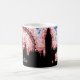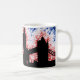 En aura i färg i det brittiska flagga belyser detta kaffe mugg med en silhuett av London, England.