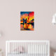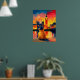 Vibrant London teddy beanie artwork featuring a contemplative teddy bear silhouette by the Thames river at sunset. Bold fauvist skyline, Elizabeth Tower geometry, and crisp segmented reflections create striking wall art perfect for london lovers, nursery decor, and modern interiors.