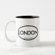Välkomnande till London! Är du från London, United Kingdom? Har du en vän eller en familjemedlem som älskar London, United Kingdom? Om så, är denna "lägeläge" mugg vad du söker efter! Designen presenterar "London" i stora svart bokstäver och "United Kingdom" i mycket liten svart bokstäver som omges av två ovaler, en som är tunn, och en som är tjock.