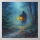 Artwork of a lone shadowy figure wandering in a dark misty forest. The solitary, silhouetted figure within a dense, misty forest painted in rich, cool tones of midnight blue, deep teal, and shadowed green. The focal point is the rendering of the lantern’s flame, which casts a highly saturated, warm golden-orange reflection onto the wet path and surrounding foliage. The heavy grain of the pastel style brilliantly simulates the visual noise of thick fog, giving the scene a tangible, mysterious depth.