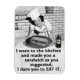 Nästa gång en chauvinist/sexist man säger samma förutsägbara "gå till köket och gör mig till en sammich"-linje, ta honom till köket och peka på den otåliga återkomsten på denna kylmagnet. Det visar en vintage kvinna med ett stolt leende på ansikte och en gigantisk macka framför henne, bredvid en flaska av gift. Texten lyder: "Jag åkte till köket och gjorde dig till en smörgås som du föreslog. Jag vågar att äta det." För vem som än kontrollerar din livsmedelsförsörjning kontrollerar ditt öde.