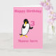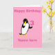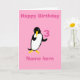 En söt tecknad penguin, barnfödelsedagskort, lägg till namn, extra-meddelande och namn inuti. Bild i tre penguiner spelar.Rosa för en flickversion.