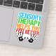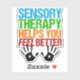 Yrkesmässig terapeutisk dekal som säger sensorisk behandling hjälper dig att känna dig bättre i roligt, ljusa färger av blått, grönt, orange och rött. En uppsättning handavtryck är under som symboliserar de fördelar som barn får från övningar som målning och lek i finger.