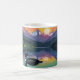 En loon ser över sin axel när han simmar i ett serenberget sjö vid solnedgången. Ljusa färger, popkonst stil som ser ut som ett silke skärm och perfekt för alla som kärlek fåglar, naturen och utomhusen.