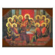 Färgmålning på och golder av "sista middag" med simon ushakov. jesus befinner sig vid ett långt rektangulärt bord med tolv apostlar med gyllene halos. vin goblet och guld med bröd vid bord i insida, dekorerat med en vacker röd raps. Brått färg och vackert balanserad målning med ett vackert golden halos skapande ett vackert flöde. lekfull mönster. dekorativ, ikon stil och målade på 1700-talet en skarp och djärv färgad ikonografisk stil som målade den nya testamentshistorien från förra middagen.