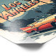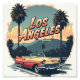 En T-shirt-vintage med texten "Los Angeles" i fet återtypografi. Nedan är det en cirkel i gräns som är så glad att en klassisk konvertibel kör genom stadens gator. Bakgrunden är handflatan träd och Hollywood-skylten i mutat färg