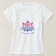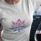 Denna t-shirt har en lotus-blomma med blå rosa färgad och texten "PEACE AND KÄRLEK" i koordinationsblå färg. Redigera den här texten efter eget önskemål. Slappna av, andas, tröst.