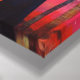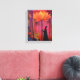 En oljemålning av en lotus blomma, med glödande fibrer ovanför den, mot bakgrund av träd med löv, lila himmel och rosa, orange och rött nyanser. En angelisk figur står bredvid träd och håller sin strunk.