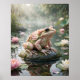 En lugn lotusgroda vilar på en flytande näckrosblad i en stilla damm där lugn vilda djur möter blomsterprakt. Realistisk grodanatomi smälter samman med lotusblad, släta blad, subtila texturer och graciösa botaniska detaljer över dess rygg, ben och krona. Reflekterande vatten, koirippel, vass, mjuk dimma och soluppgångsljus skapar en fridfull spa-liknande atmosfär. Denna raffinerade fantasnaturdesign tillför harmoni till badrum, meditationsrum, välbefinnandeutrymmen eller presentinsamlingar. Perfekt för grodälskare, zen-dekorationsfans och lugnande botaniska interiörer.