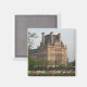 Det här är en del av Louvre Museum i Paris, Frankrike. Fotot togs i vår och tulpaner syns i förgrunden. Det är ett vackert skådespel av byggnadens fasad.