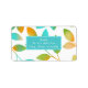 Etiketter som är tryckta med löv i originalform, med akvarieblått, grönt och orange på vit bakgrund.