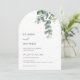 Denna eleganta minimalistiska moderna välvda bröllopsinbjudan har akvarellmålade eukalyptusblad på en vit bakgrund.