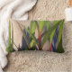 Bilden av retro-tyg av ZoeSPEAK på denna Lumbar Pillow skapades från ett originalfoto av långt, tunt grönt löv i solljus sent på eftermiddagen, vilket kastar blå skuggor på stuckväggen bakom. Växterna är mexikanska petunier, med rödaktiga stjälkar. Stämningen sömnig sommareftermiddagen från tidigare tider.