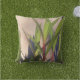 Bilden av textil på denna utomhusruta Dekorativ kudde skapades från ett originalfoto av ZoeSPEAK av långa, tunna löv i grönt i solljus sent på eftermiddagen, vilket kastar blå skuggor på stuckväggen bakom. Växterna är mexikanska petunier, med rödaktiga stjälkar. Stämningen sömnig sommareftermiddagen från tidigare tider.