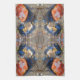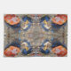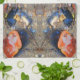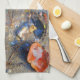 Abstrakten mönster på detta färglösa kökshandduk tillverkades av ett originalfoto av ZoeSPEAK av fallna löv på en liten strand som är kantad med mangrove träd. Löv är en ljusröd orange. Andra löv är gult och blå marin med koboltmarkeringar. Små snäckor blandas med sanden, och några gräs nål lägger till visuellt struktur.