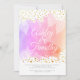 Vit löv på rosa, lila och korallvatten samt guld konetti kalligraphy vår bröllop inbjudan.