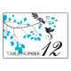 Det här bordsnumret har två fåglar med blå accenter och en träd gren med motsvarande blå löv.