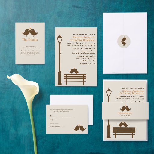 I tillkännagivanden eller favörer i bröllop spara datum finns en bra illustration av två fåglar på en parkbänk. Perfekt för fall, vinter, sommar eller vår bröllop. Besök vår affär för att hitta matchande produkter och mer möhippa, t.ex. bröllopsinbjudningar, tackkort, adressetiketter, bachelorette och möhippa inbjudningskort med mera!