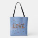 A bright blue sky with thin wisps of clouds becomes a canvas for hope as dozens of colorful abstract fluttering butterflies come together to form the word LOVE. This artwork is a celebration of love, hope and joy in all its forms — gentle, vibrant, and always moving forward. Add a touch of happiness, inspiration and a pop of color to your day while hauling the essentials with this uplifting bag.