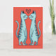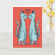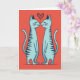 This greeting card shows two tall, stylized cats in teal-blue standing on a warm coral-orange background. They face each other in the center, gently touching noses, with their eyes closed and small, content smiles. A deep red heart sits right above their heads, and it has a dotted texture that makes it feel a bit handmade. The cats also have a light speckled texture, with darker blue-gray stripes and long, curved tails that mirror each other. The simple, balanced layout keeps your attention on their sweet moment of affection and closeness. There isn’t any text on the front, so the image does all the talking and leaves space for your own message ❤️💌. It’s a cozy little design that fits romance or close friendship, especially with a hint of chocolate-day charm 🍫. Hope it helps you share your Valentine’s Day sentiments with someone you care about.