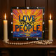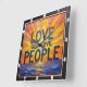 This image showcases a vibrant and inspiring artwork. The artwork features the text "LOVE GOD, LOVE PEOPLE" in bold, colorful letters against a dynamic background. The top half of the background radiates with warm hues of yellow, orange, and red, resembling a sunburst, while the bottom half transitions into cooler tones of blue and purple, evoking a sense of water or sky. The use of bright colors and dynamic brush strokes creates an uplifting and motivational visual effect.