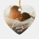 This heart shaped ornament features the word love in an elegant script over a custom photo with initials in a simple, modern font. This design features a single photo of the newlywed couple. A beautiful keepsake for the bride and groom.