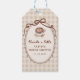 Add a charming touch to your celebration with these Love is Brewing Gingham Coffee Bridal Shower Favor Gift Tags. Designed with a watercolor latte topped with heart foam art, coffee beans, "Thanks a Latte" in trendy script calligraphy, a vintage bow frame, and a soft beige gingham background, this cozy cafe inspired design brings warmth and elegance to your bridal shower favors. Perfect for a fall or neutral theme, these tags pair beautifully with coordinating “Love is Brewing” invitations and decor from the collection.
