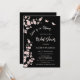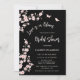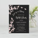 This elegant blush pink and black bridal shower invitation showcases the saying 'Love is in bloom,' adorned with beautiful blush pink cherry blossoms and two butterflies on a black background. The backside includes a QR code for the person of honor's gift registry.