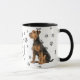 This mug for the Airedale Terrier Dog owner features an artist's portrait of a beautiful Airedale Terrier. The image is printed twice, and between them is an oval with the black text that says "Love my Airedale Terrier". The oval and dog images are placed on a white background sprinkled with paw prints. You may easily change the text to something else, or personalize it, if you'd like.