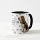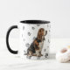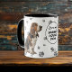 This mug for the Basset Hound Dog owner features a portrait of an adorable Basset. The image is printed twice, and between them is an oval with the black text that says "Love my BASSET HOUND DOG". The oval and dog images are placed on a background sprinkled with paw prints. Your monogram or name is in a customizable text field at the bottom.
