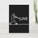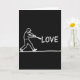 This greeting card features a chalk-on-blackboard style scene with a white-outline baseball player frozen mid-swing, his body angled forward with focused energy as if he’s sending a little affection out into the night 🥰. The background is a deep, solid black, making the rough, grainy white marks feel intimate, like a note left on a classroom board after hours. To the player’s right, the word “LOVE” appears in large, hand-drawn white letters, floating at about chest height as though the bat is about to tap it forward ❤️. The placement creates a gentle story of reaching out, with the swing reading less like aggression and more like a careful, committed gesture. The player’s outline is simple but expressive, with the bat arcing toward the text and the stance suggesting motion and intention. The lettering is slightly uneven and textured, with chalk dust edges that make each letter feel soft against the dark space. Near the bottom, a single thin white horizontal line runs across the card to ground the figure, like a baseline beneath his stride.