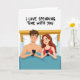 This greeting card shows a sweet couple tucked into bed under a teal blanket, with a warm wooden headboard behind them. The man has neat brown hair, and the woman has long auburn hair, and both have slightly rosy cheeks and small, relaxed smiles. Each of them is holding a smartphone, which adds a real-life touch while still feeling caring and close. The background is plain white, so the teal bedding and the woman’s red camisole stand out right away. At the top of the card, the words “I LOVE SPENDING TIME WITH YOU” appear in a handwritten script style, set in dark lettering across the upper area. The message pairs nicely with the scene, showing that being together matters even when you’re doing your own thing. It’s a calm, affectionate design that fits romance or close friendship, with a cozy feel ❤️💌.